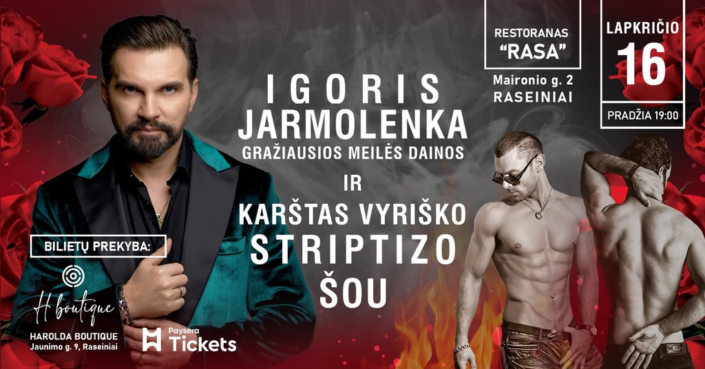 🎟 Bilietus platina 'Harolda boutique' (Jaunimo g. 9, tel. 860894702) bei Paysera Tickets https://tickets.paysera.com/lt/event/igoris-jarmolenka-ir-striptizo-zvaigzdziu-sou-raseiniai