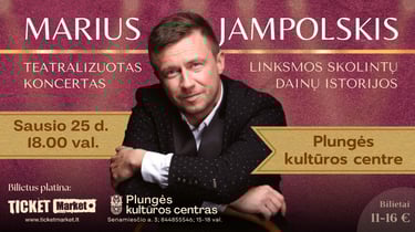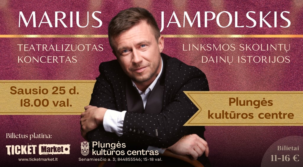 🎟 Bilietus platina Plungės kultūros centras (Senamiesčio a. 3; 844855546; 15-18 val.) bei Ticket Market https://www.ticketmarket.lt/lt/e/renginys/marius-jampolskis-plunges-kulturos-centras-bilietai. Bilieto kaina TIK NUO 11€ (vaikams iki 3m nemokamai). Renginio dieną bilietai brangs!
