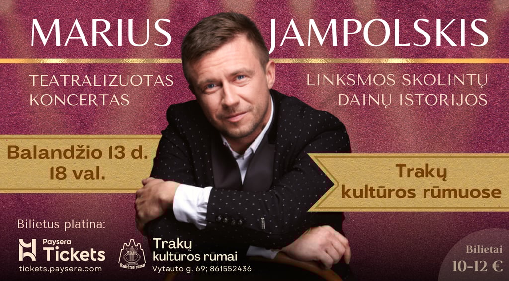 🎟 Bilietus platina Trakų kultūros rūmų kasa (Vytauto g. 69; 861552436) bei Paysera Tickets https://tickets.paysera.com/lt/event/m-jampolskio-teatralizuotas-koncertas-trakuose. Išankstinio bilieto kaina 10-12€ (vaikams iki 3m nemokamai). Renginio dieną bilietai brangs!