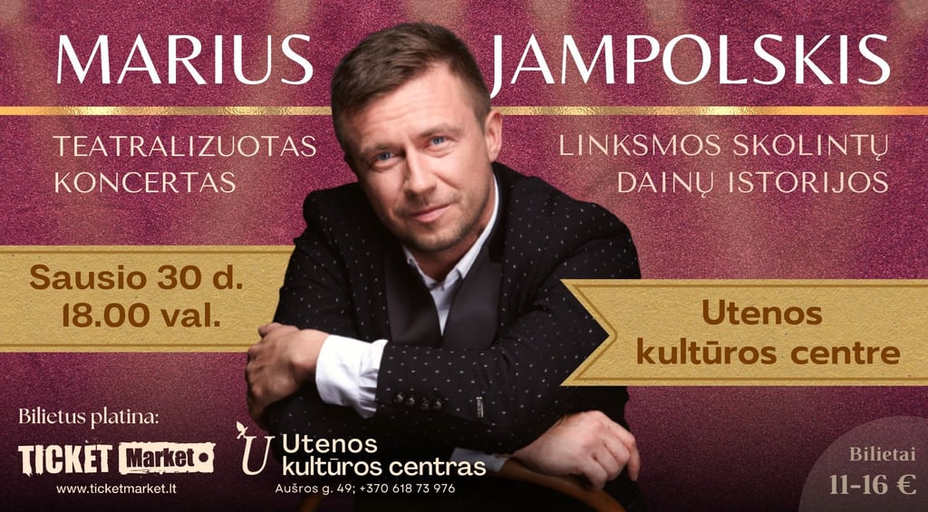 🎟 Bilietus platina Utenos kultūros centras (Aušros g. 49; 861873976) bei Ticket Market https://www.ticketmarket.lt/lt/e/renginys/marius-jampolskis-utenos-kulturos-centras-bilietai. Bilieto kaina TIK NUO 11€ (vaikams iki 3m nemokamai). Renginio dieną bilietai brangs!