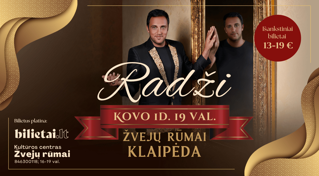 🎟 Bilietus platina Žvejų rūmų kultūros centro kasa (Taikos pr. 70; 846300118; I-V 16-19 val.) bei bilietai.lt https://www.bilietai.lt/lit/renginiai/koncertai/muzikinis-pasimatymas-su-radzi-klaipedoje-381179/. Bilieto kaina 13-19€ (vaikams iki 3m nemokamai). Renginio dieną bilietai brangs!